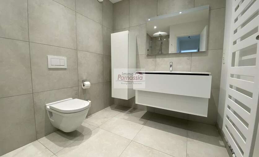 U komt binnen in de hal waar zich ook een vestiaire en toilet bevinden. De woonkamer met parket geeft toegang tot het aangename terras. Er is een volledig ingerichte open keuken. Verder in de nachthal bevinden zich 2 slaapkamers met parket, een douchekamer met toilet en een berging met aansluiting voor een wasmachine en droogkast.